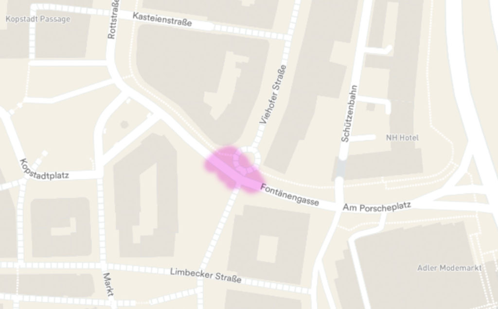 Auf Grund der erforderlichen Breite des Ûberwegs sollte geprüft werden, ob es nicht sinnvoller ist, die Fontänengasse ab der Parkhaus-Zufahrt zum „Verkehrsberuhigten Bereich“ (Verkehrszeichen 325) umzuwandeln.