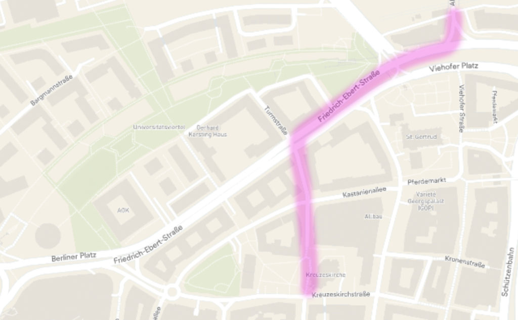 Der größte Teil dieser Strecke ist doch heute schon problemlos mit dem Rad zu befahren. Kritisch ist nur die Verbindung zwischen III. Hagen und Turmstraße, sprich die Querung von Limbecker und Brandstraße. Das ist hier aber ausgespart. Ideen dazu?