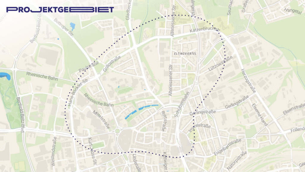Von Juni bis November 2020 war »Beweg Dein Quartier« im Essener Nordviertel und Umgebung unterwegs. Das Quartier wurde ganz bewusst aufgrund seiner diversen Herausforderungen in puncto Mobilität und der Vielschichtigkeit seiner Nutzungen und Akteur*innen ausgewählt. Dabei ist die Gebietseingrenzung grundsätzlich unscharf gehalten, um Verknüpfungen sichtbar zu machen und um zu verhindern, dass interessante und wichtige Orte von vornherein ausgeschlossen werden. Hinweise, die zu Orten eingehen, die zu weit vom Projektgebiet entfernt liegen, werden gebündelt weitergeleitet, können aber nicht innerhalb von »Beweg Dein Quartier« berücksichtigt werden.
