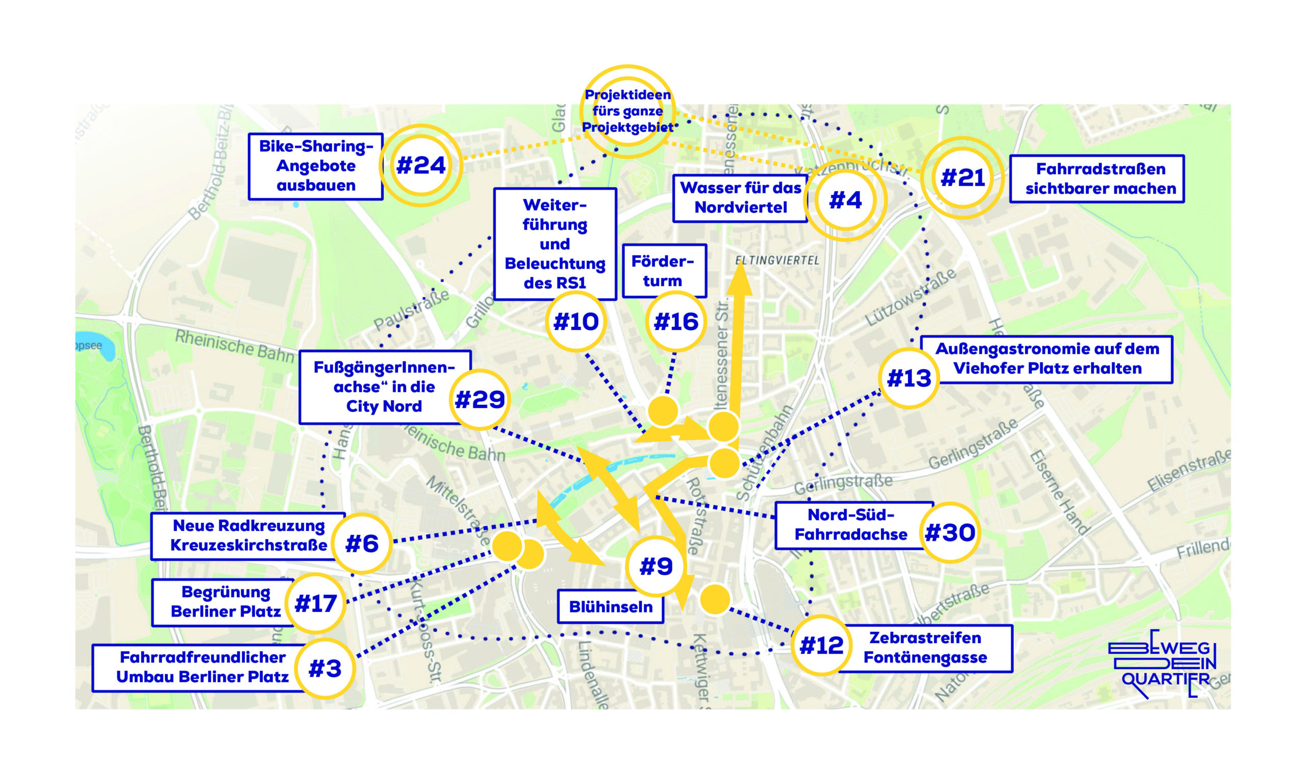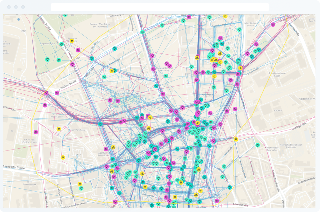 Die Karte zeigt die gewählten Top-13-Projekte von »Beweg Dein Quartier« in Essen. Diese sind als Schlüsselprojekte in die Agenda-Map eingeflossen. Bis zum 8. Januar 2021 konnten die Ideen hier kommentiert werden.