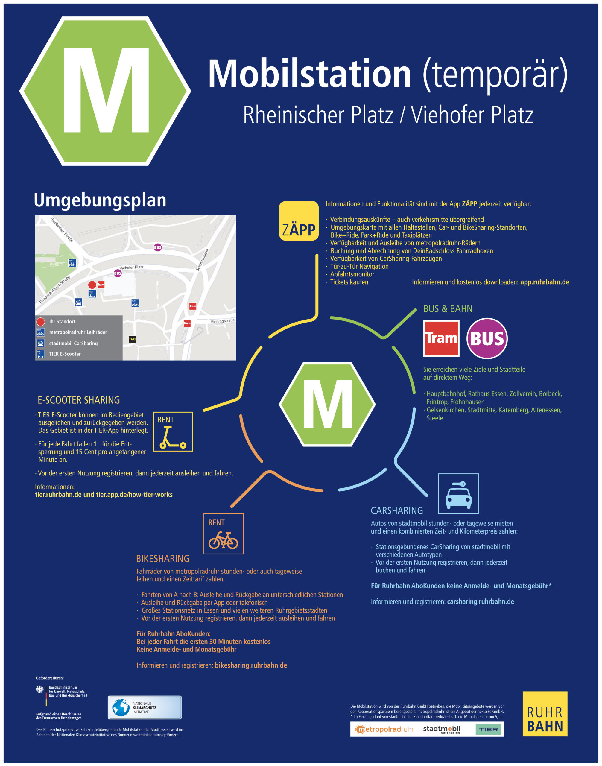 Von Mitte September bis Dezember 2020 wurde in Zusammenarbeit mit dem Carsharing-Anbieter stadtmobil und dem Essener Verkehrsunternehmen Ruhrbahn eine temporäre Mobilstation am Rheinischen Platz in Essen eingerichtet (Rottstraße/Ecke Friedrich-Ebert-Straße).