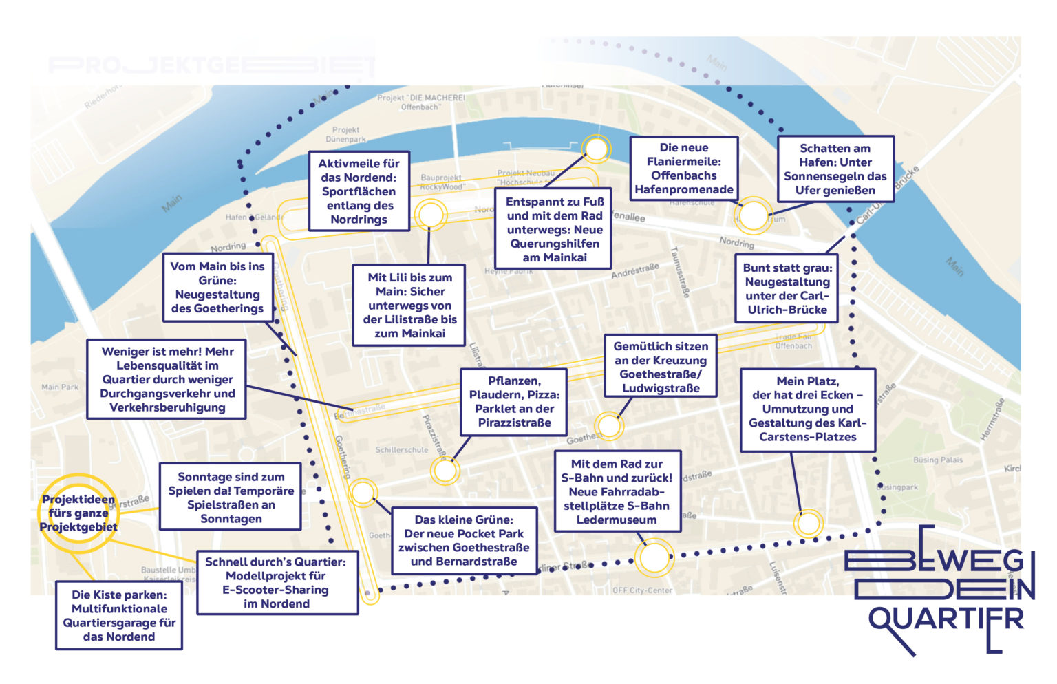 Die Top-16-Projektideen stehen fest! Sie werden als Schlüsselprojekte im weiteren Verlauf von »Beweg Dein Quartier« gemeinsam mit Bürger*innen, Stakeholder*innen, Vertreter*innen der Verwaltung und externen Expert*innen weiterbearbeitet und bilden schlussendlich den Kern der »Agenda-Map« für Nordend und Hafen.